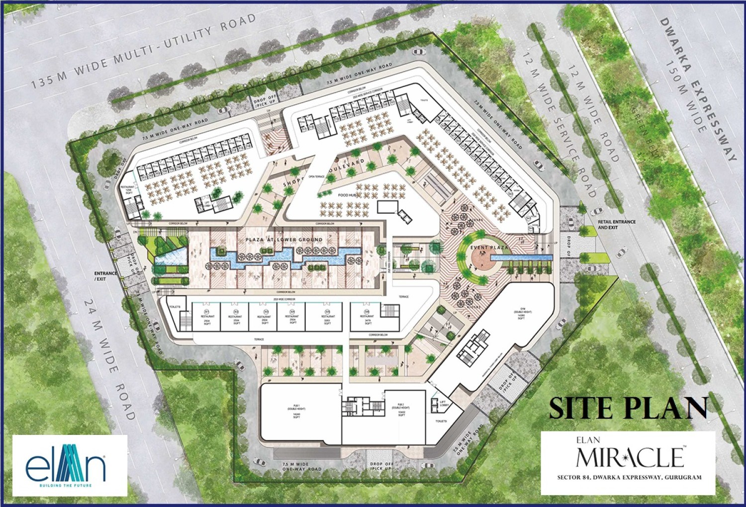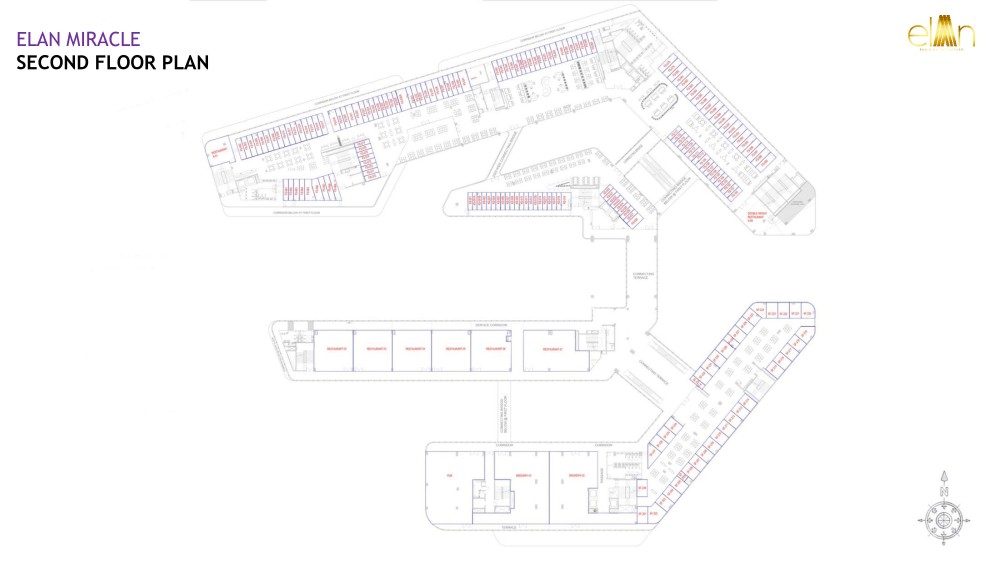 Elan Miracle is a world class unto itself. Stepping into this commercial marvel will be like entering a galaxy of one of its kind futuristic retail space. On three sides elan miracle is enclosed by major roads like dwarka expressway, multi utility corridor and 24-meter wide sector road, upscale residential hubs and plentiful green territories enclose the edifice. Elan miracle has double height shops, one of India’s biggest superplex with PVR, Food court, Luxury studio apartments with a lavish clubhouse. Elan miracle is high street retail with double height shops on ground and first floor dedicated to retails and anchor stores with huge multi-activity atrium space. The lower ground floor id dedicated to hypermarket & retail shops both. Elan, in association with PVR Cinemas, brings one of the nation’s largest Superplex / Multiplex to Gurugram. The Superplex will boast 18 screen, featuring Premier, Gold Class, IMAX, 4D, 5D and 7D. Undoubtedly, the ever-evolving experience will reach the next level at Miracle. Hypermarkets are at sunken court & Amphitheatre with jet water pop-ups. There will be huge landscaped courtyards & sitting space with retail view all around. On of its kind, the food court at Miracle is all set to take the feasting experience to next level. Under this canopy of most excellent multi-cuisine restaurants, the Miracle Food Court makes shopping all the more fun. Food Court is well connected to Superplex / Multiplex and Entertainment Zone. The service apartments are a perfect example of high-end luxury living and rejuvenating destination. Elan Mircale’s Serviced Apartments boast an extensive blend of luxurious amenities and services like a round-the-clock concierge, assistant / house help on call, stylists, state-of-the-art Gym & Spa, high-speed Internet and satellite TV. The Chivalrous Club at Elevated landscaped deck with infinity Pool & Wading Pool, Jogging Track, Open Dining and Activity Area, 24*7 Wi-Fi Zone, Cigar Lounge, Exotic Sauna, Spa & Yoga Studio and many international sports activity. Elan Miracle is located on 150 meters Dwarka Expressway, 135 meters Multi-Utility Corridor & 24 meter sector road. Elan Miracle is strategically located in sector 84, which is well connected to CPR, SPR, ISBT & upcoming Metro Station.it is hardly 15 min drive from international Airport