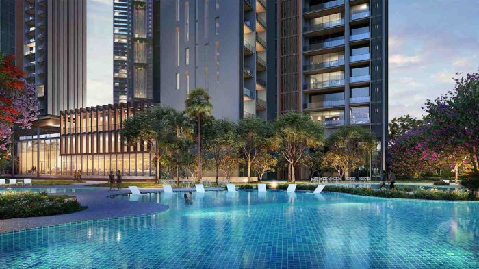 Multiple themed swimming pools, spa zones, a grand clubhouse, indoor sports arenas, and wellness spaces create a resort-like atmosphere.