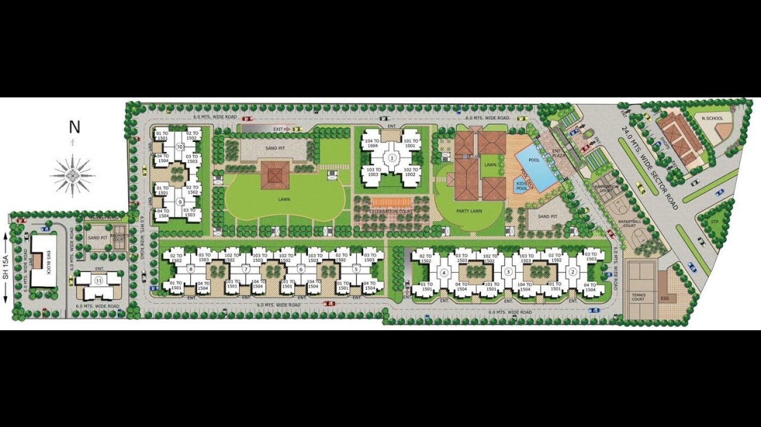 The complex is built around a green hub, that provides perfect spaces for the children to play freely and also enhances and furthers the feeling of joy, interaction and sharing among neighbours. Landscaping has been used in such a way that everyday life in the complex is tinged with green lawns that extend right upto the buildings, colourful connecting walkways, and drop-off areas that give you a pleasant and verdant welcome every single day.